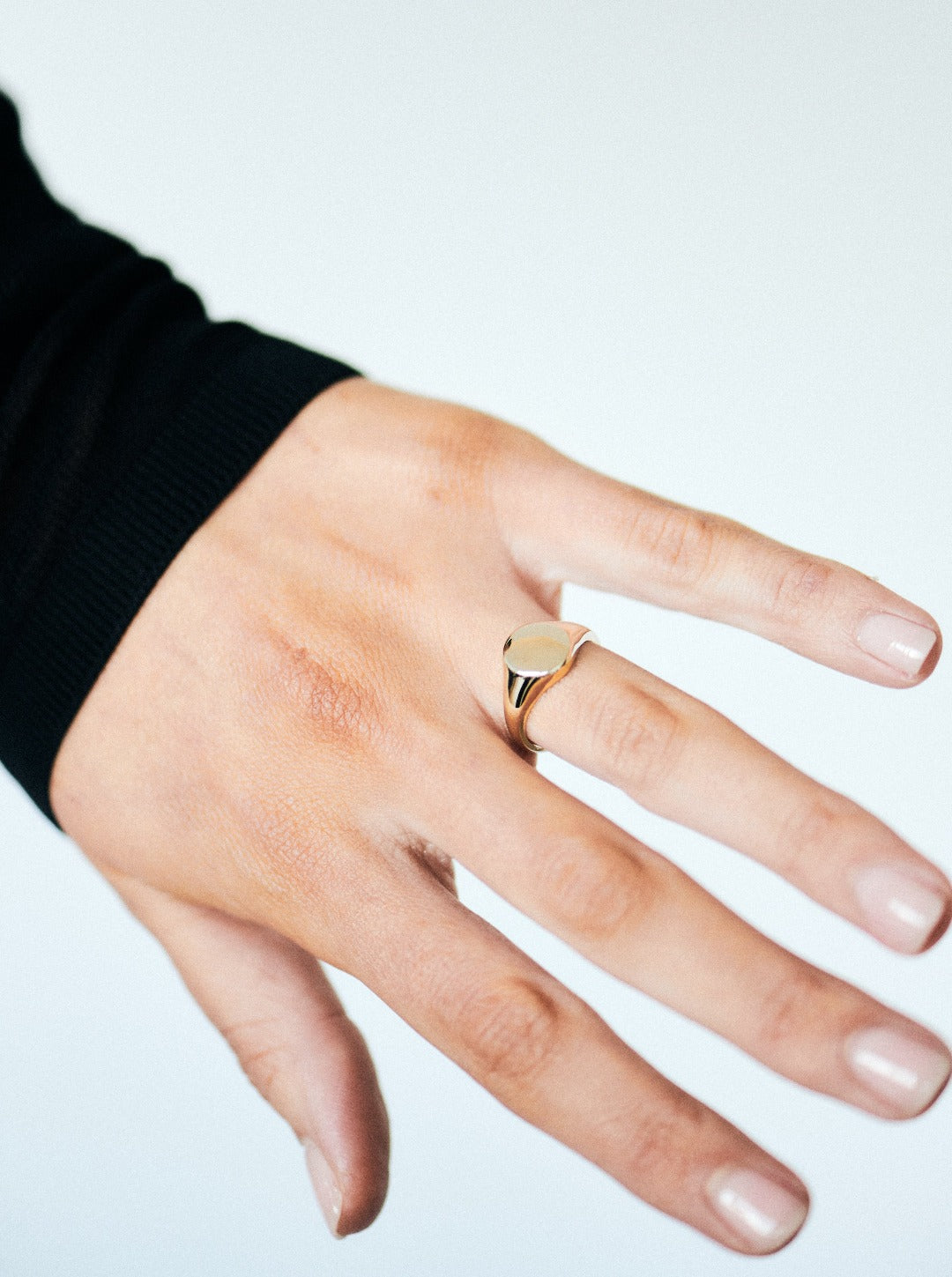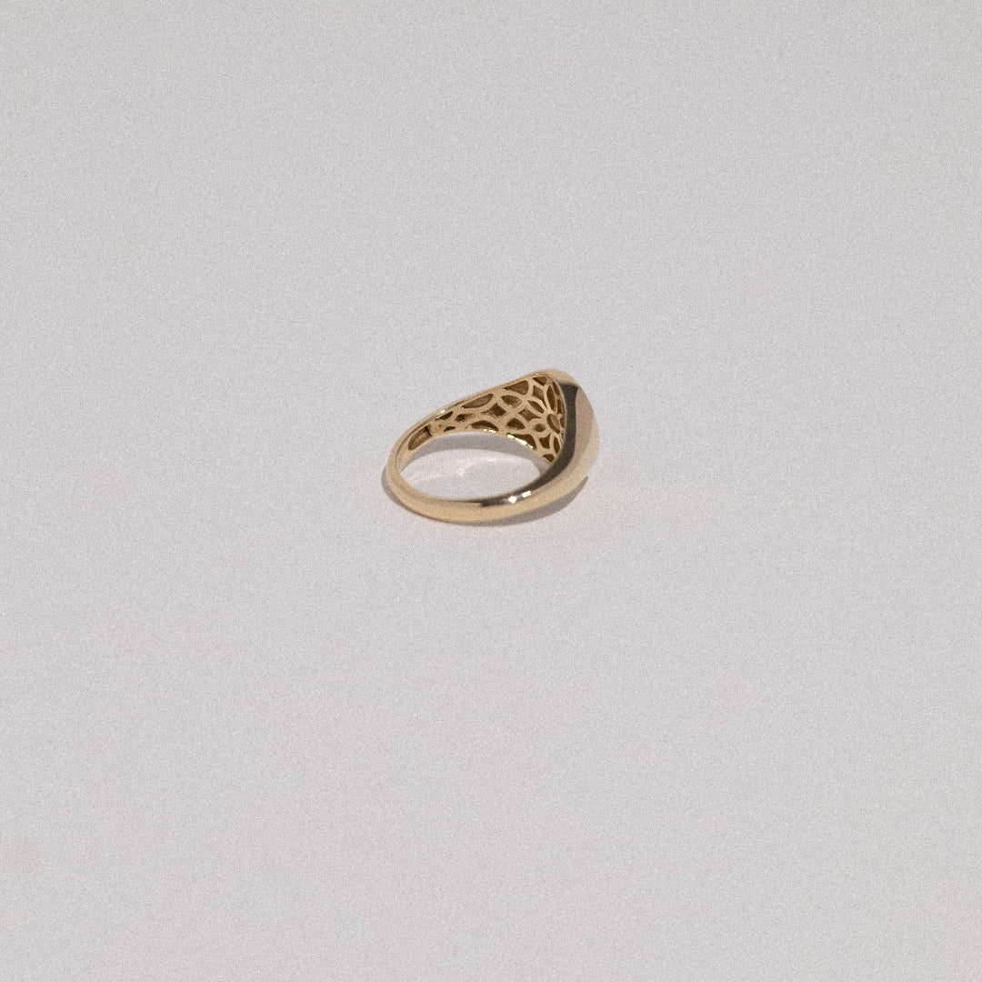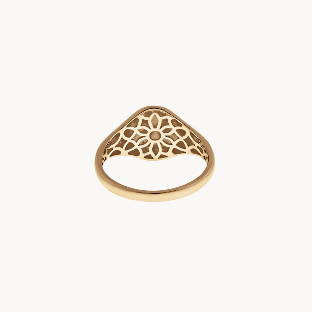 Our heirloom oval signet ring is crafted in solid 14K gold. Dainty in feel, yet timeless in durability. Its lightweight form sits comfortably on the finger, while the intricate filigree underside brings quiet luxury to a classic silhouette.
