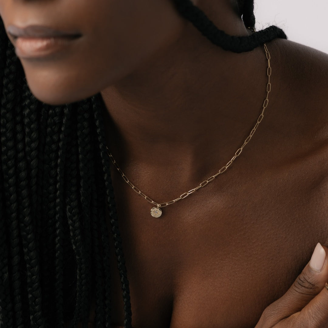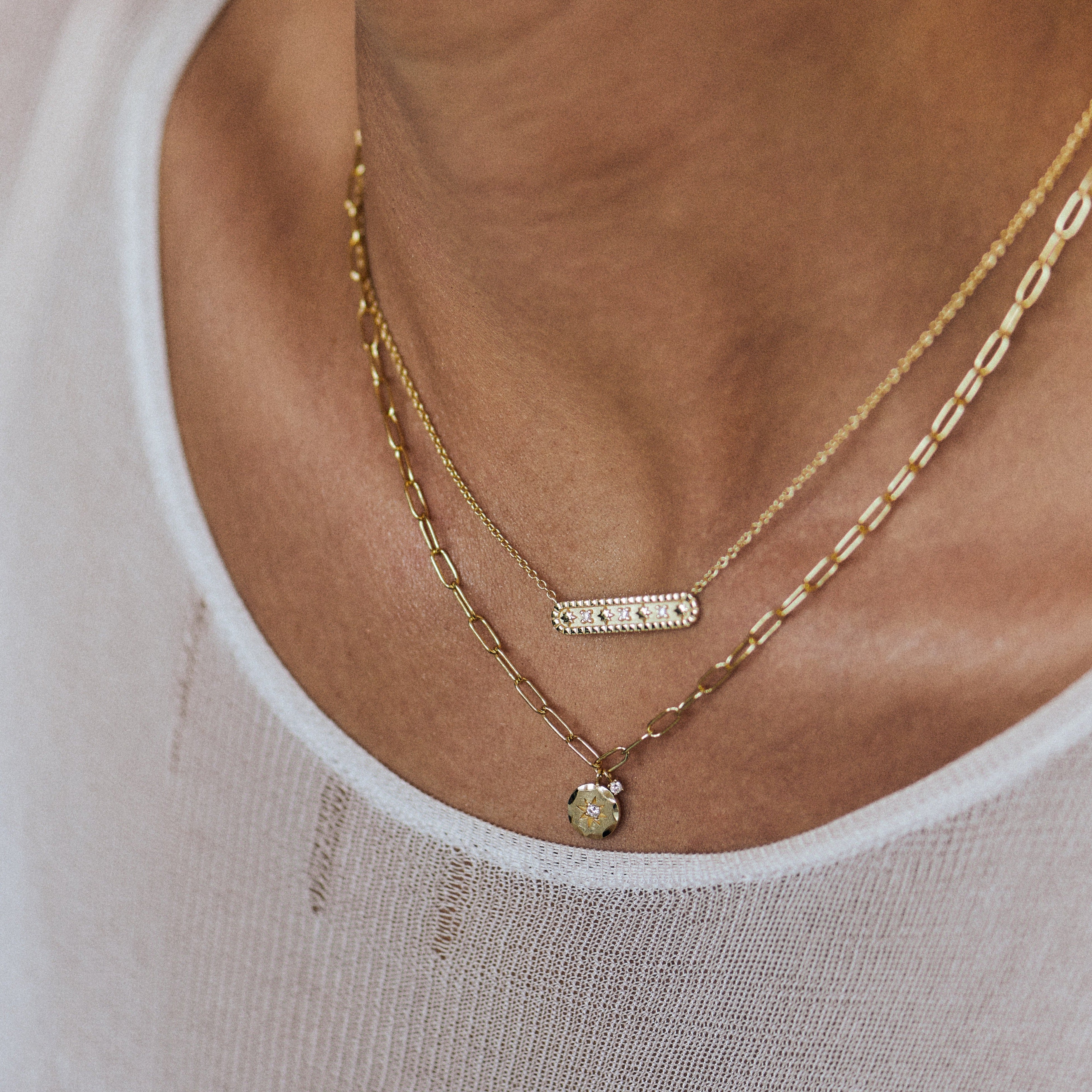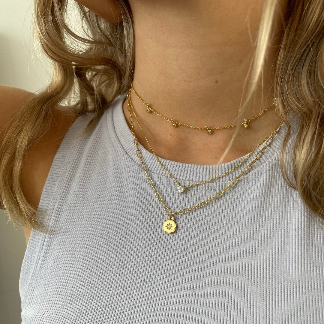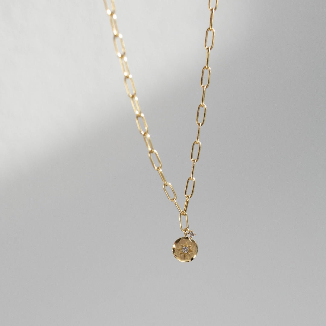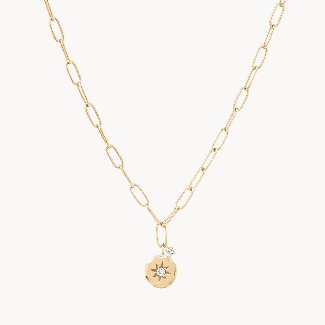 A chunky chain necklace featuring a textured disc that hangs from the middle of the chain. This disc is designed with an engraved star and Cubic Zirconia placed in the middle. Sitting pretty just above the disc is a delicate Cubic Zirconia.