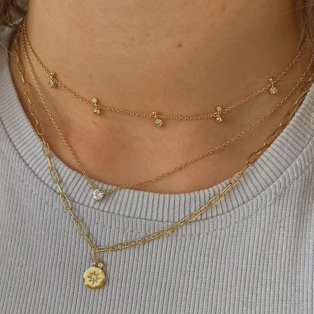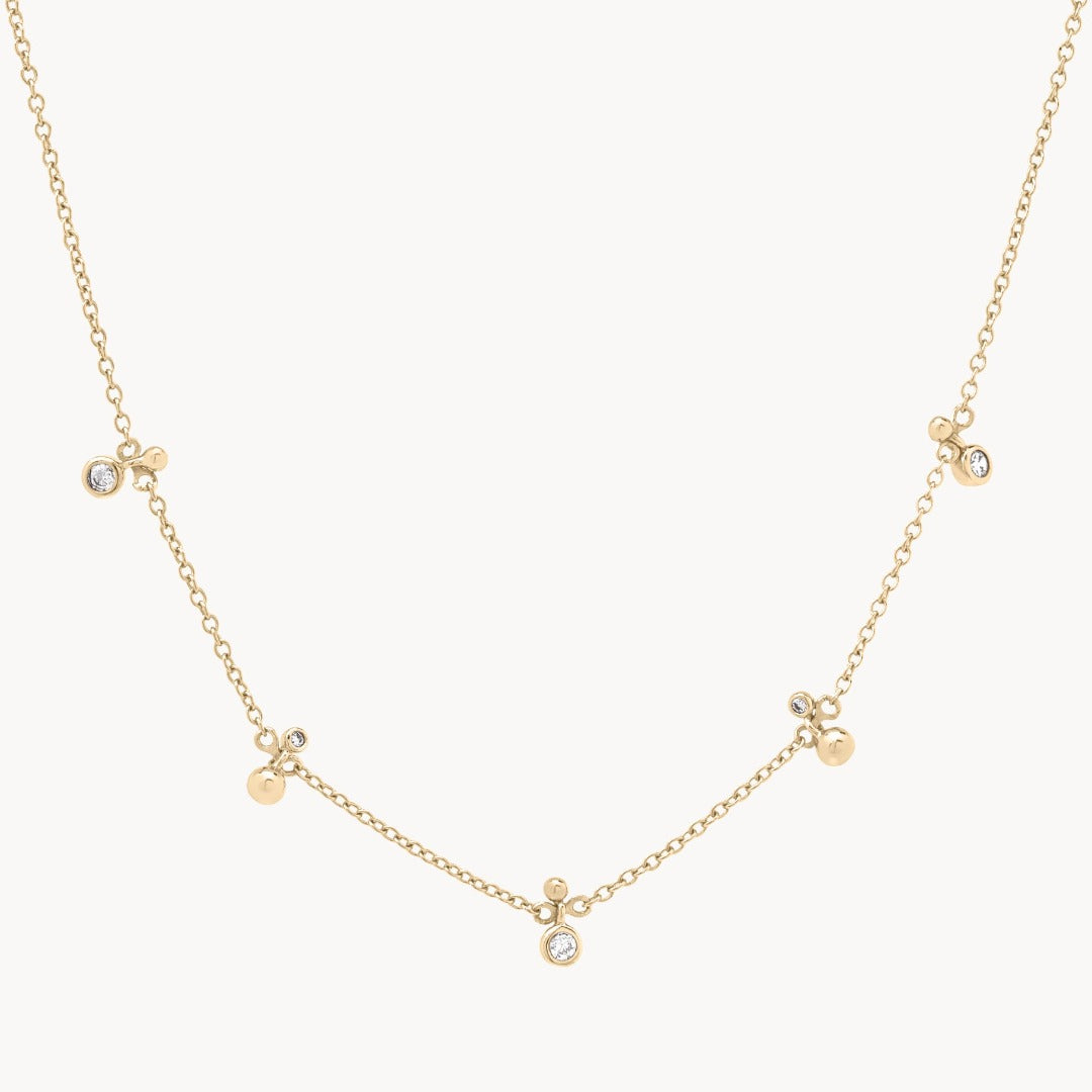 An ode to the summer nights spent under the Capri sunsets. This delicate necklace features alternating Cubic Zirconias and gold ball droplets to emulate the night sky stars.