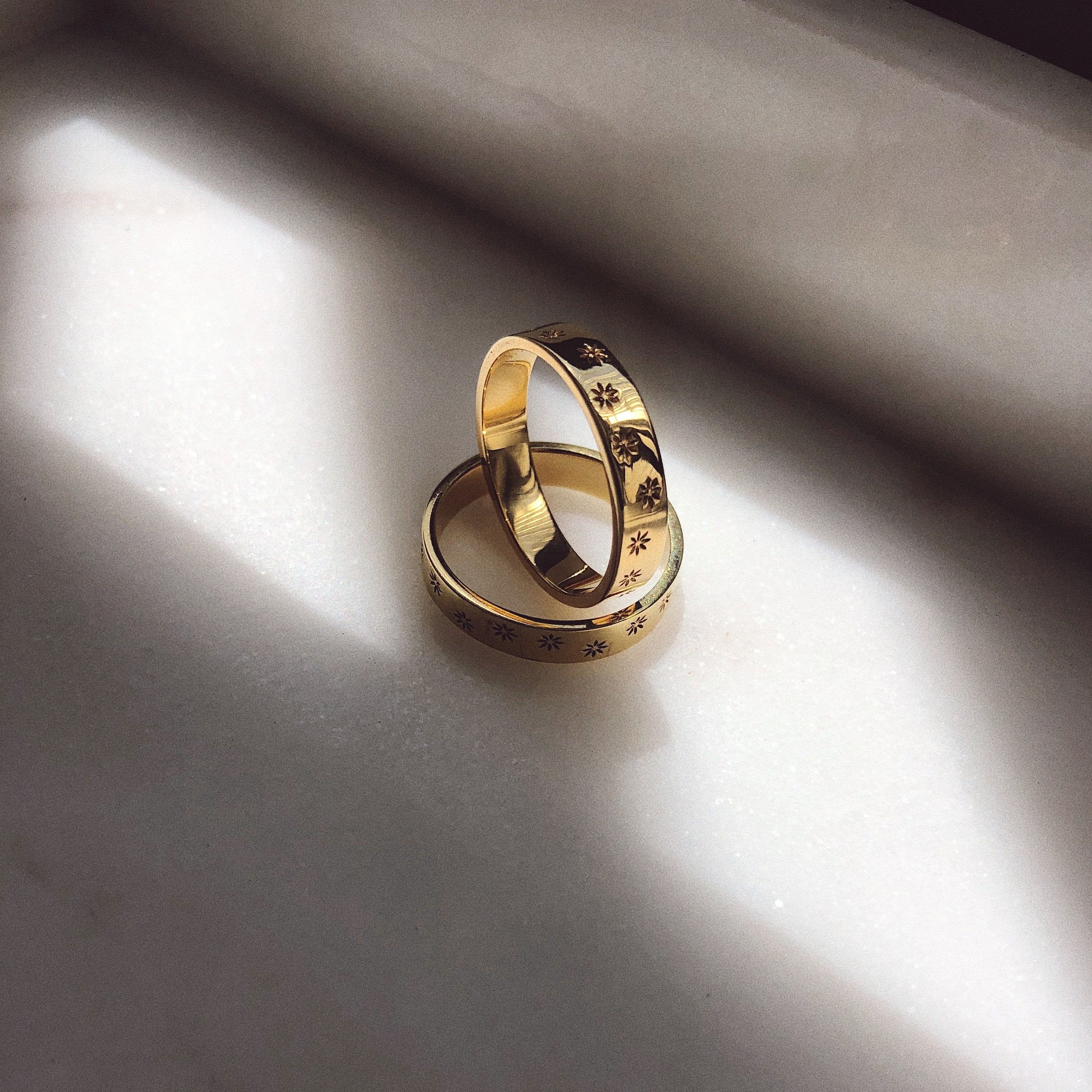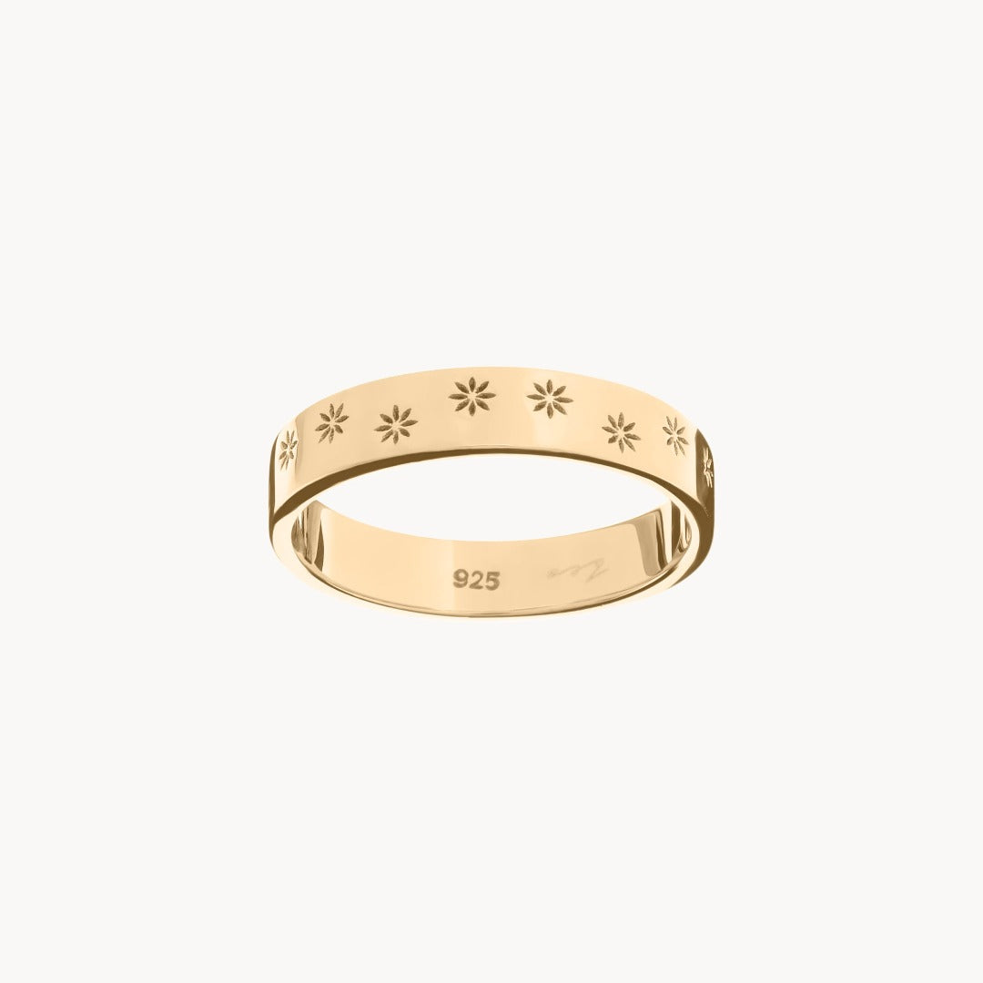Our very own in-house love story, a ring close to our hearts here at Esq.  This design is based off of our very own custom heirloom pieces handed down through 2 generations. The ring features lightly embossed 8-point design around a 4mm band.