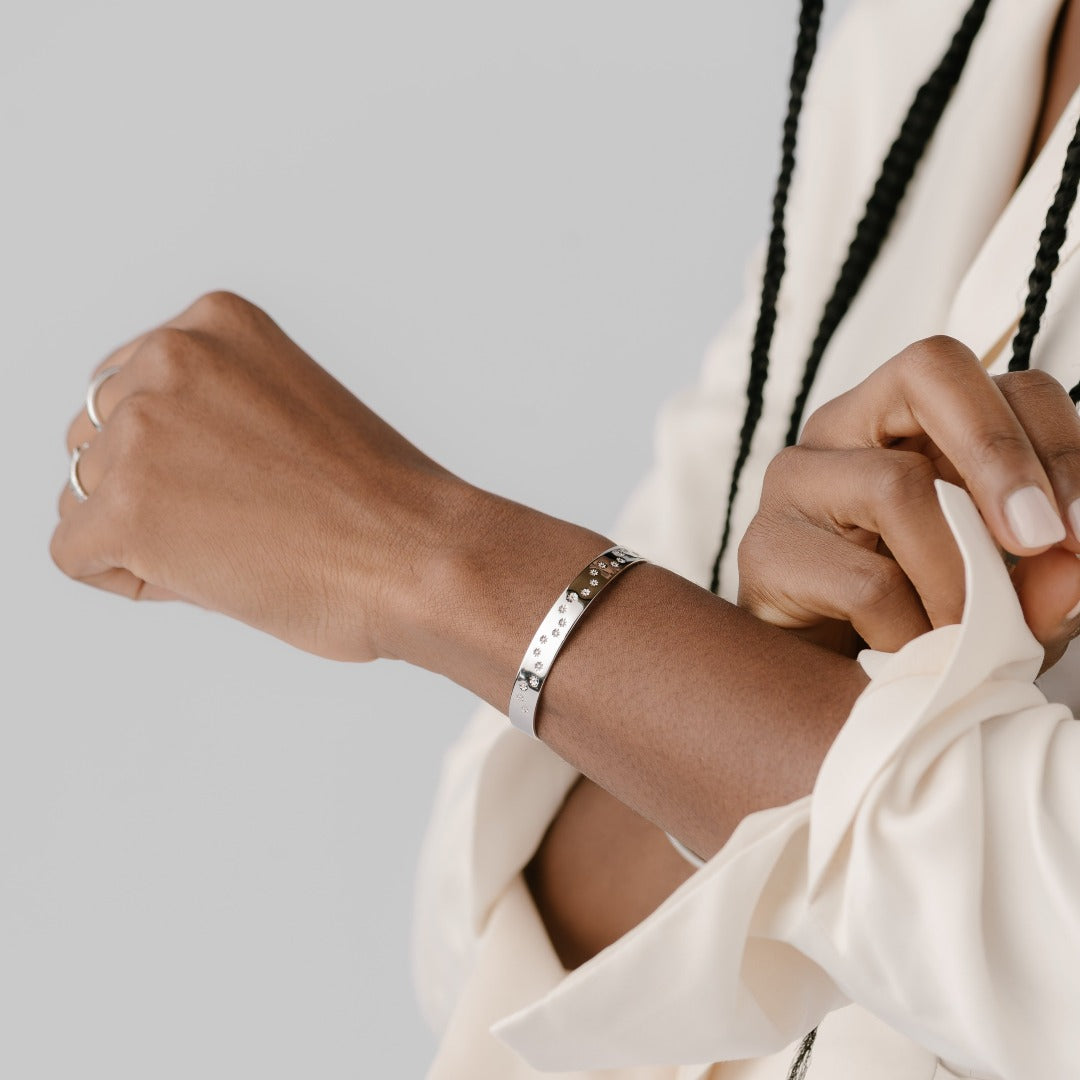 Our very own in-house love story, a cuff close to our hearts here at Esq. This design is based off of our very own custom heirloom pieces handed down through 2 generations. This cuff features lightly embossed 8-point design around a 7mm band.