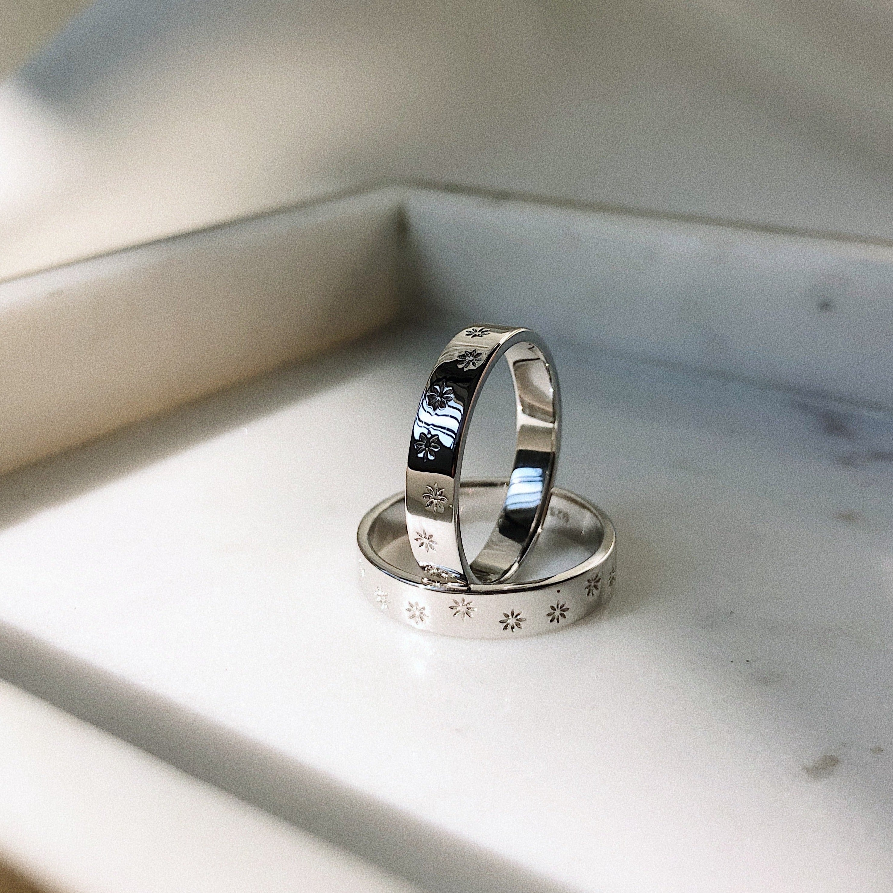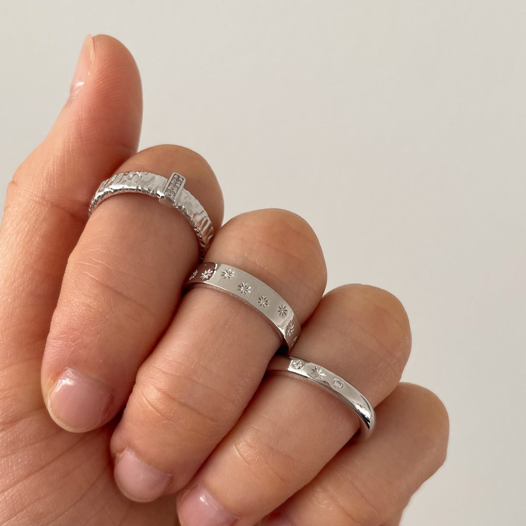A ring close to our hearts here at Esq; a design replicated from one of our very own staff heirlooms. The ring features lightly embossed 8-point design around a 4mm band.