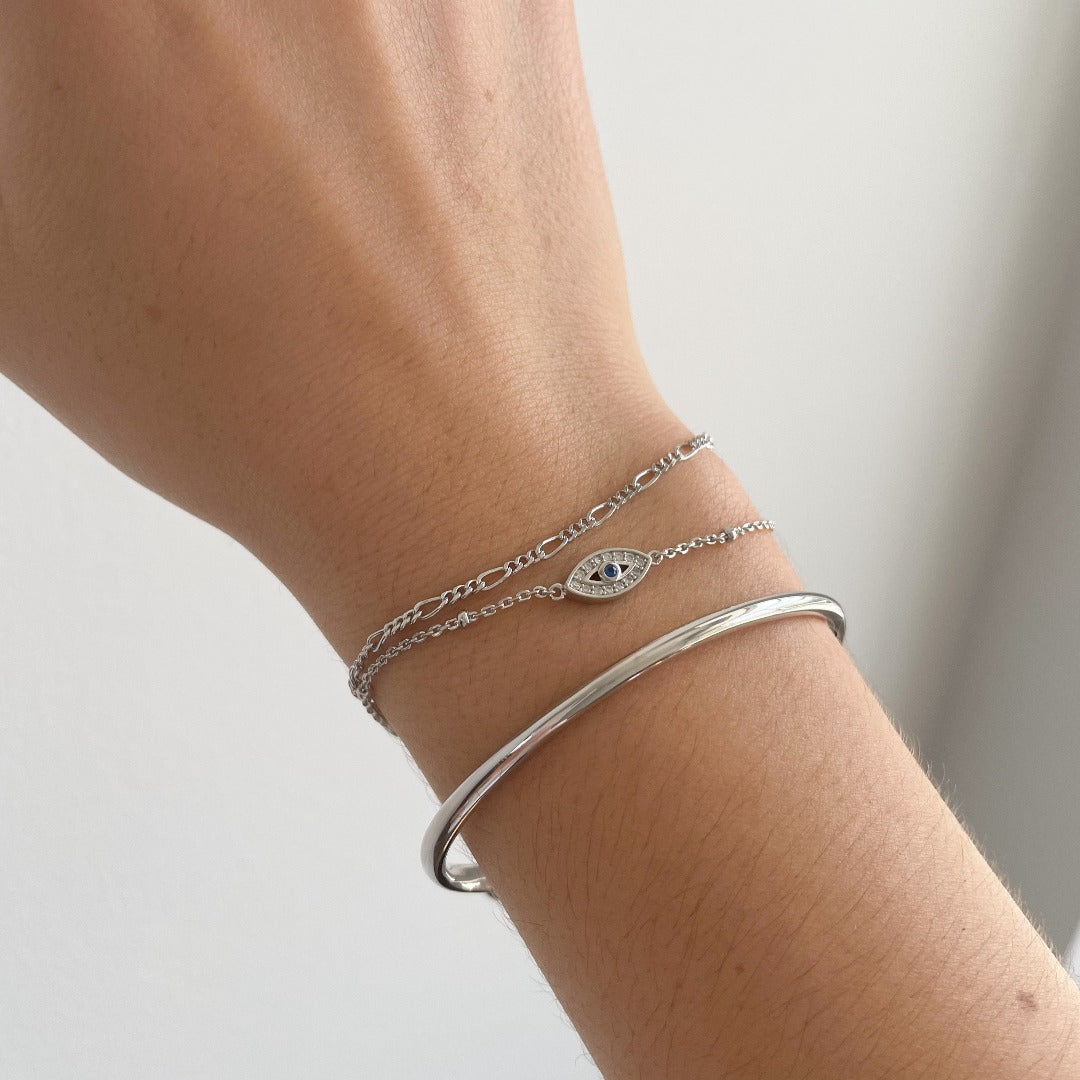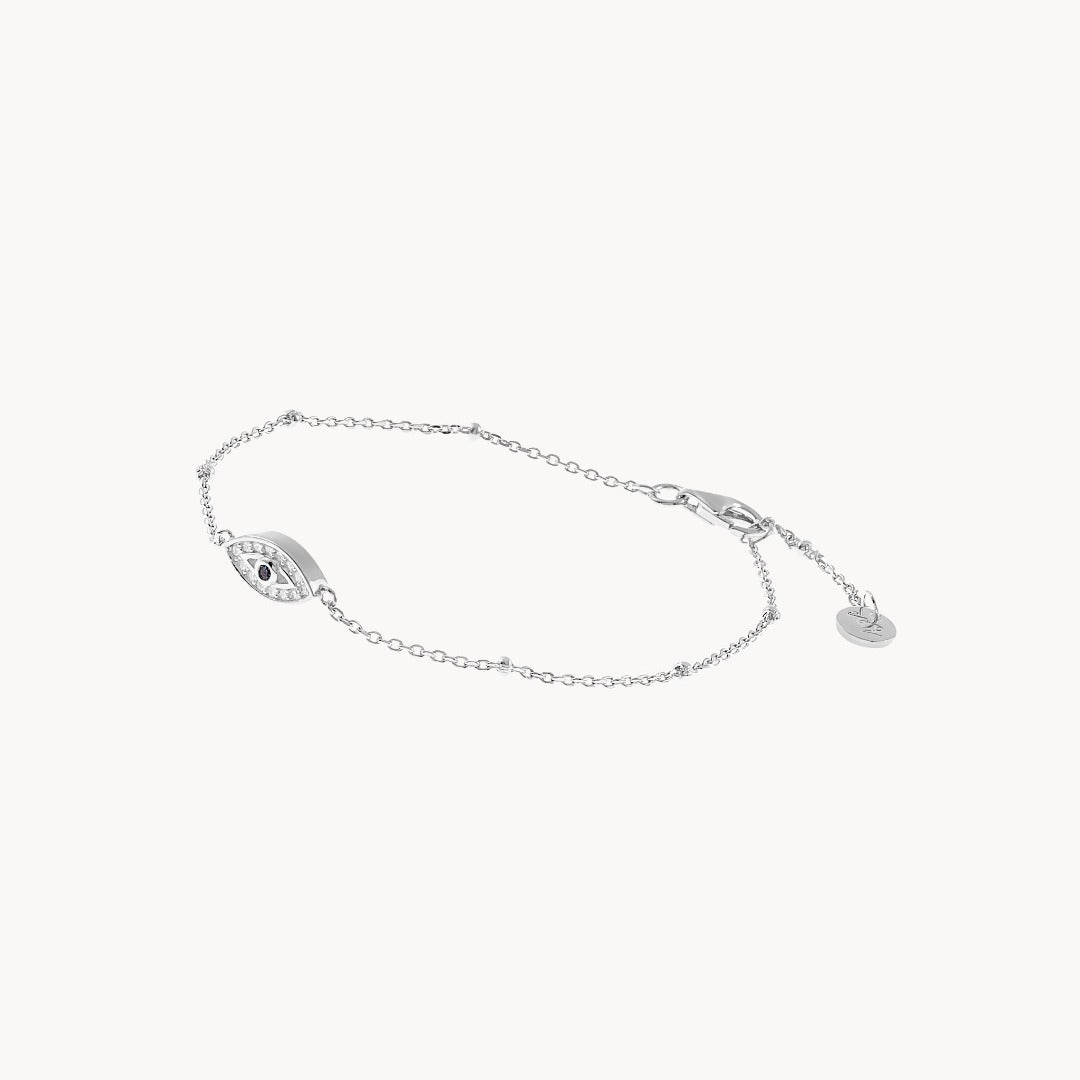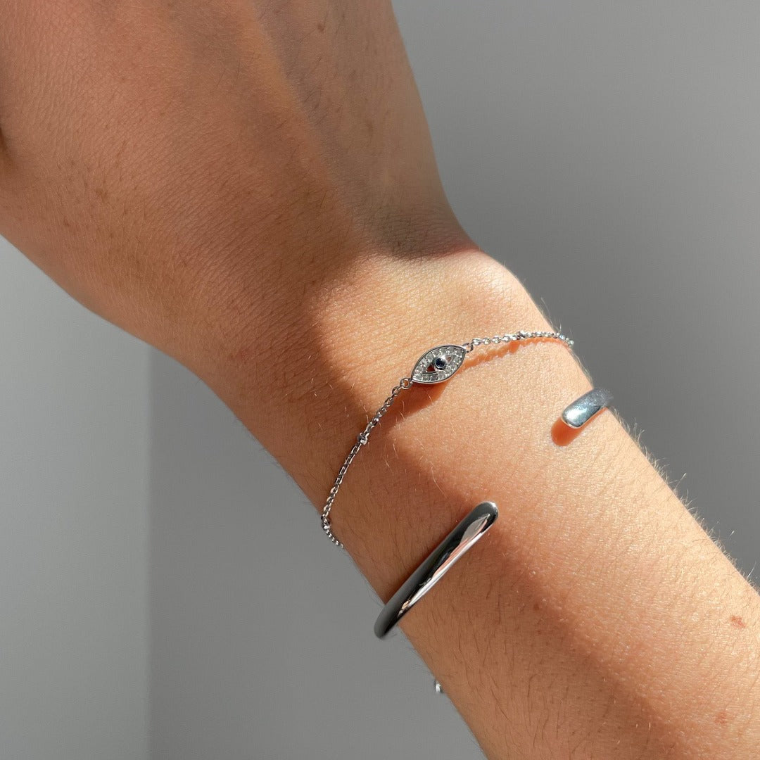 The evil eye has a deep and meaningful history, believed to provide protection from evil forces. The Esq evil eye includes a double-sided sapphire-coloured glass stone eye on a fine ball chain.