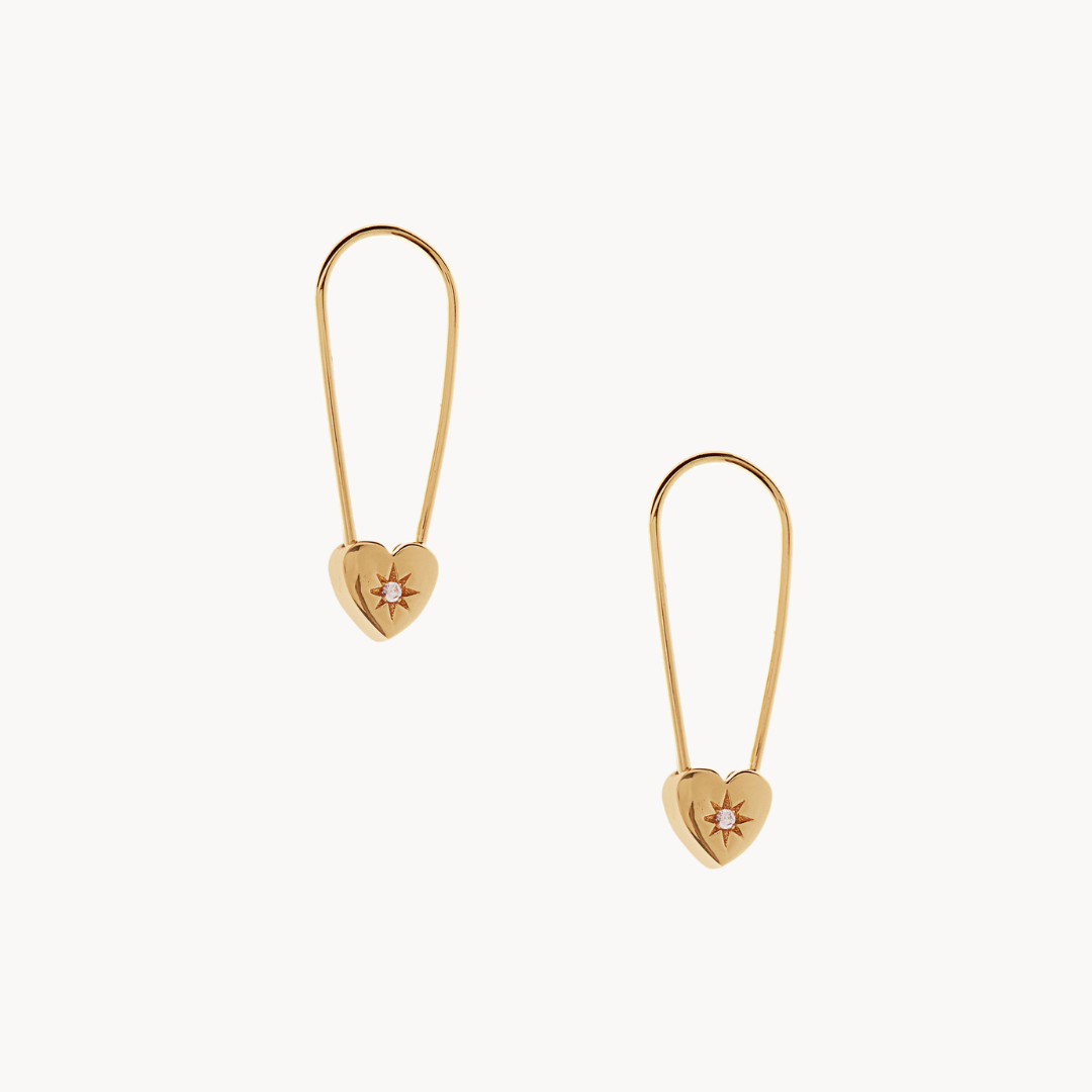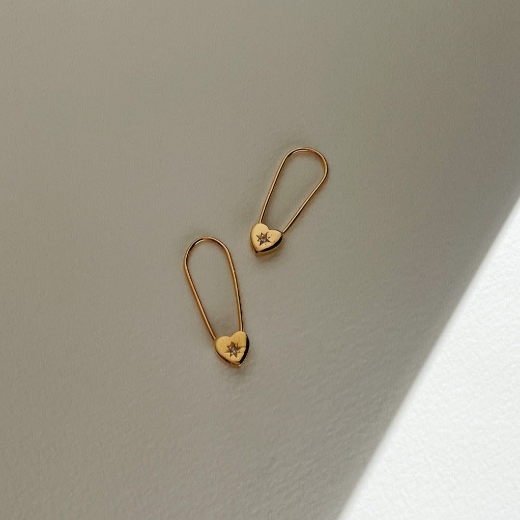 Safety pin earrings with heart detailing on the base & a push-latch close.