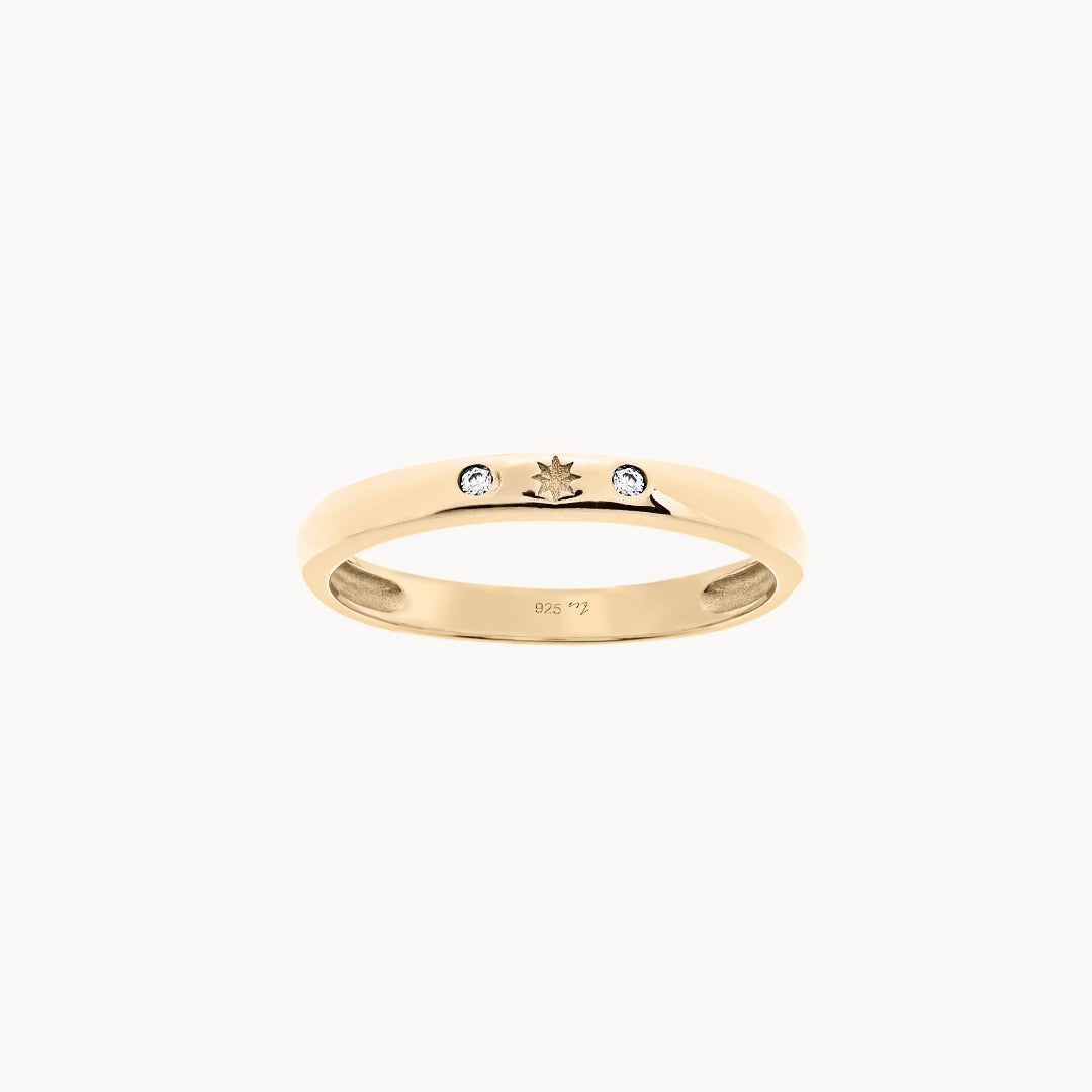 A delicate ring that has a smooth curved design with an engraved star and two Cubic Zirconias delicately set into the middle.
