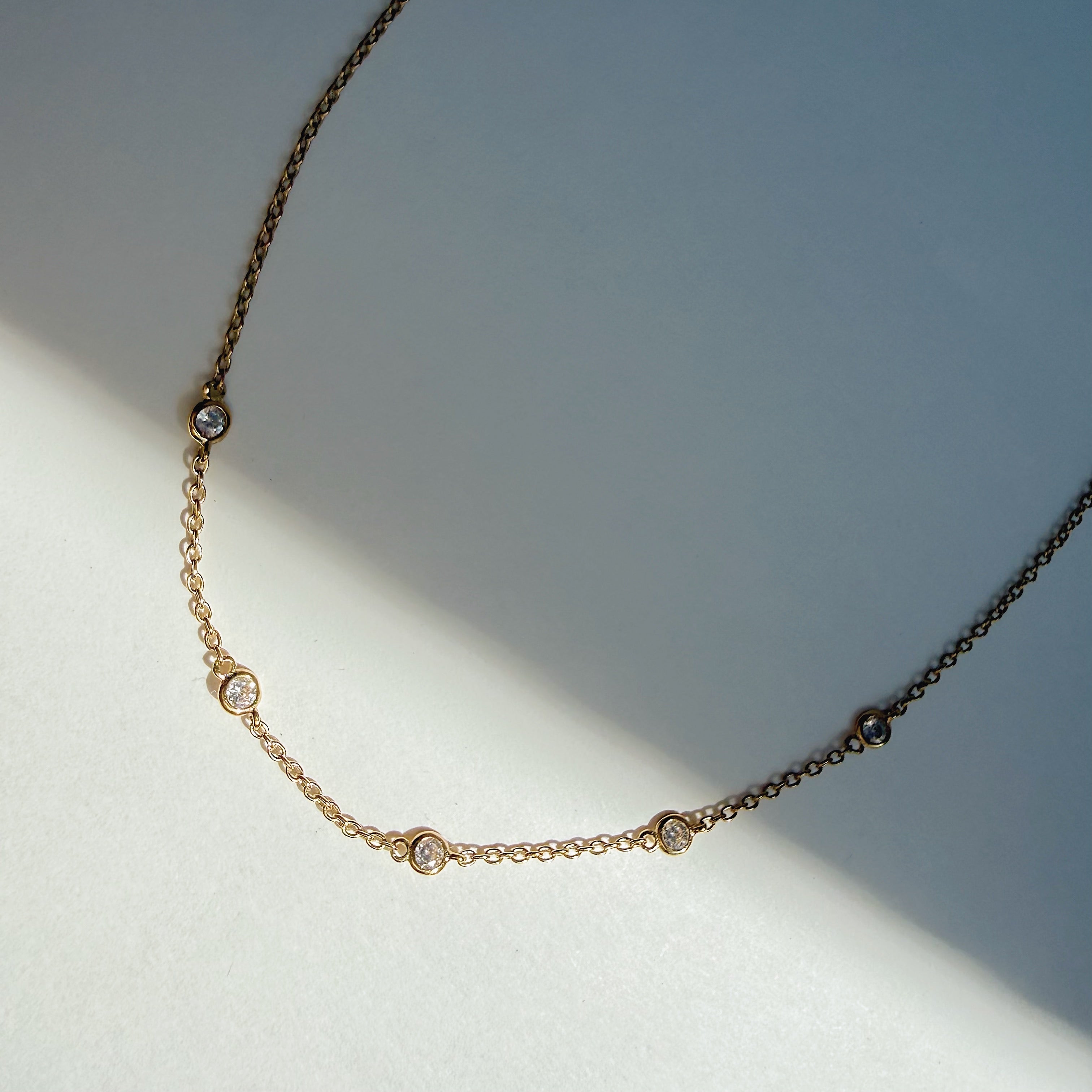 A minimalist dream, this necklace features tiny cubic zirconias delicately spaced along a sleek, fine chain for subtle sparkle. Designed short, it can be worn as a chic choker or adjusted to sit gracefully on the décolletage.