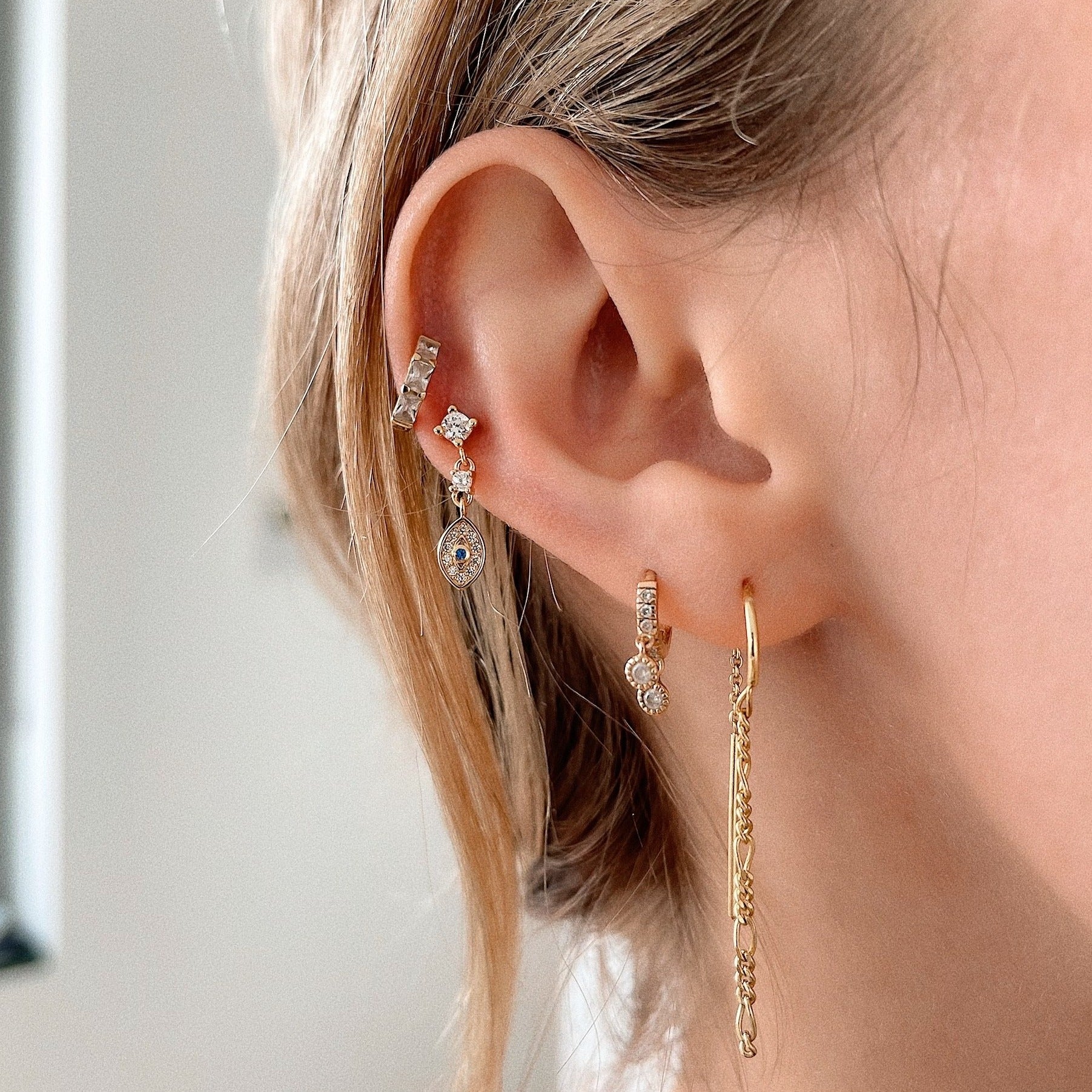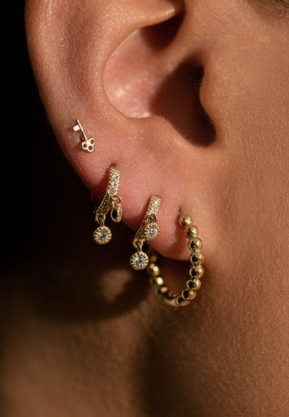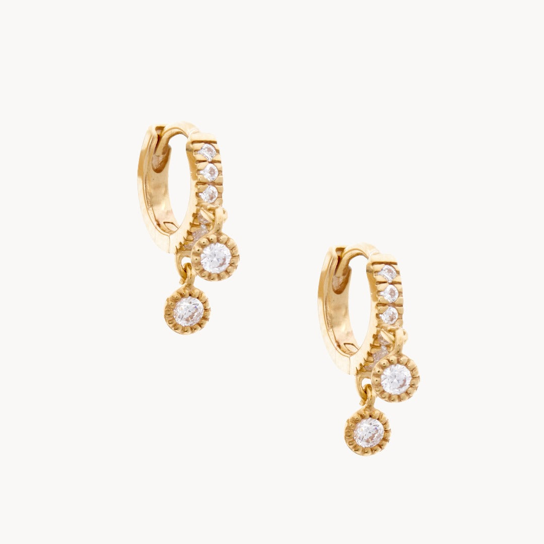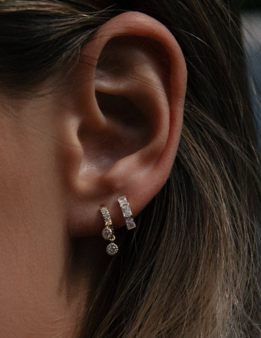 The Maya cubic zirconia huggie hoops. Created to hug the ear with two dainty hanging cubic zirconias.