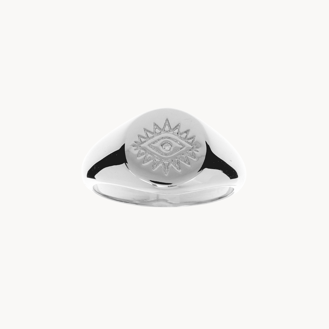 The Nazar signet ring features a finely detailed eye motif set with a tiny cubic zirconia centre and framed by delicate sun-ray engraving- an elegant nod to the traditional evil-eye symbol. It’s protective, meaningful, and beautifully minimal.