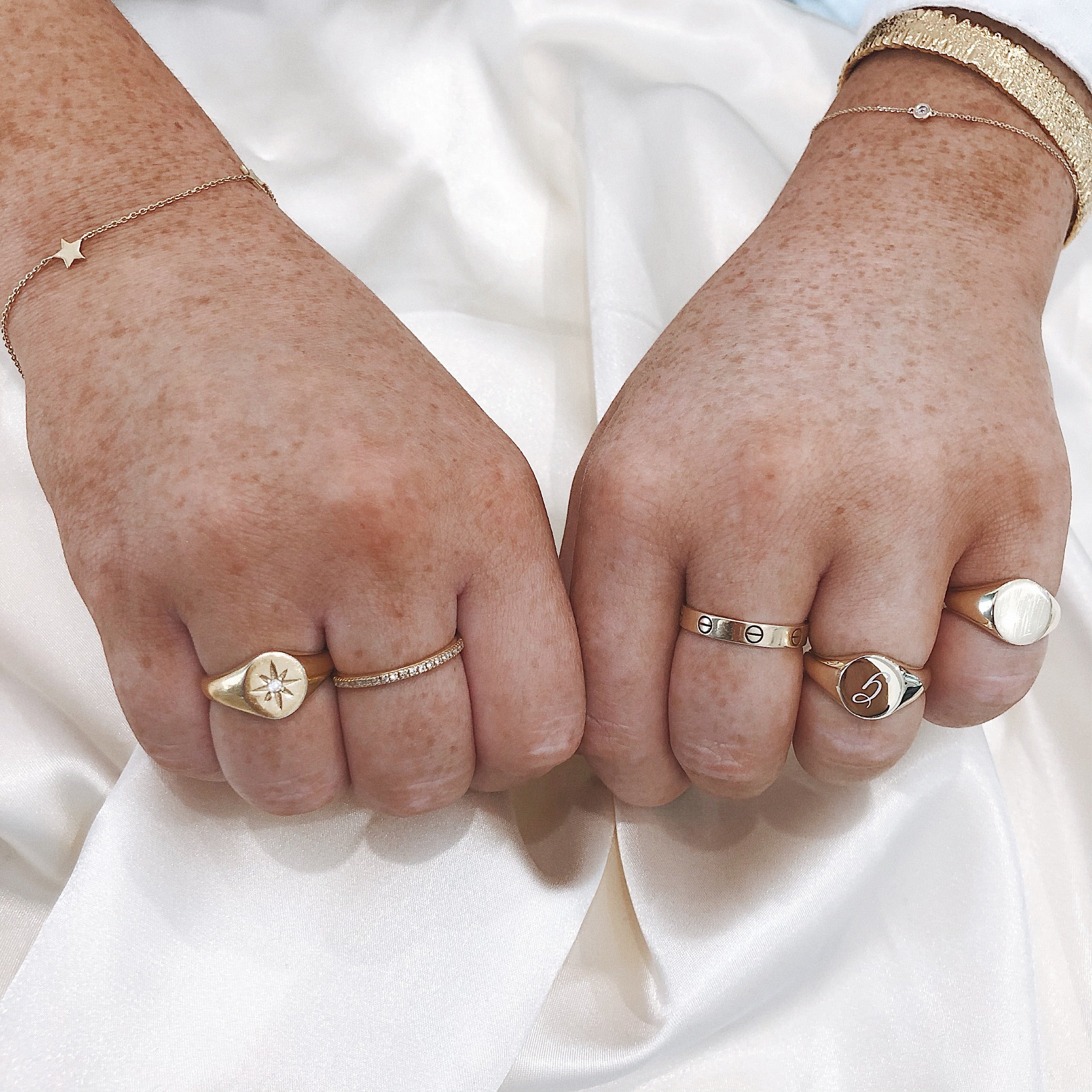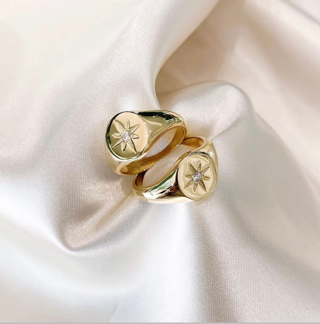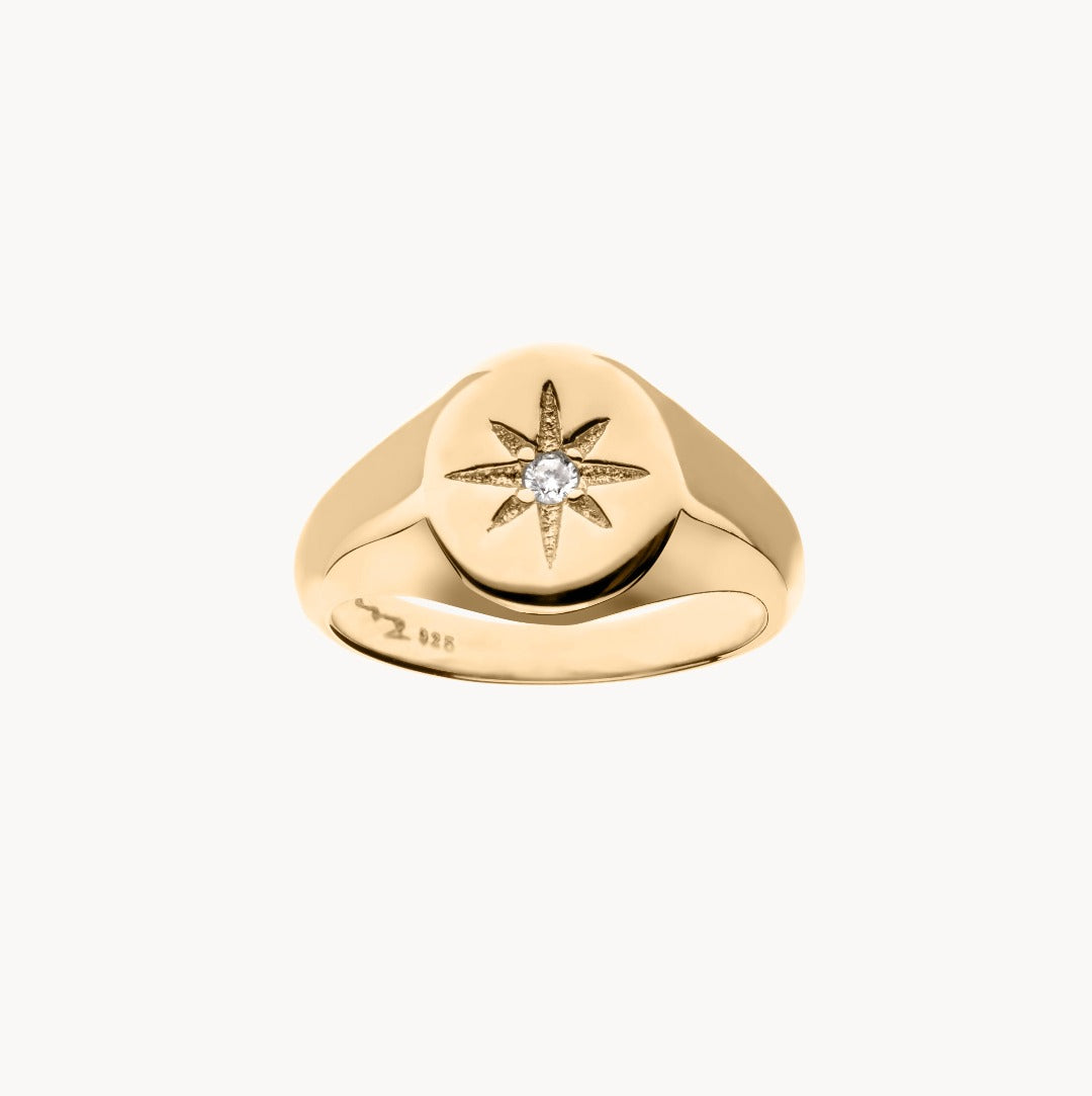 North Star gold signet ring, with a fine white cubic zirconia on an oval face.
