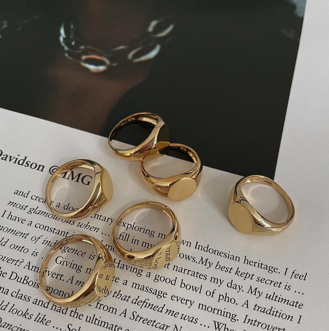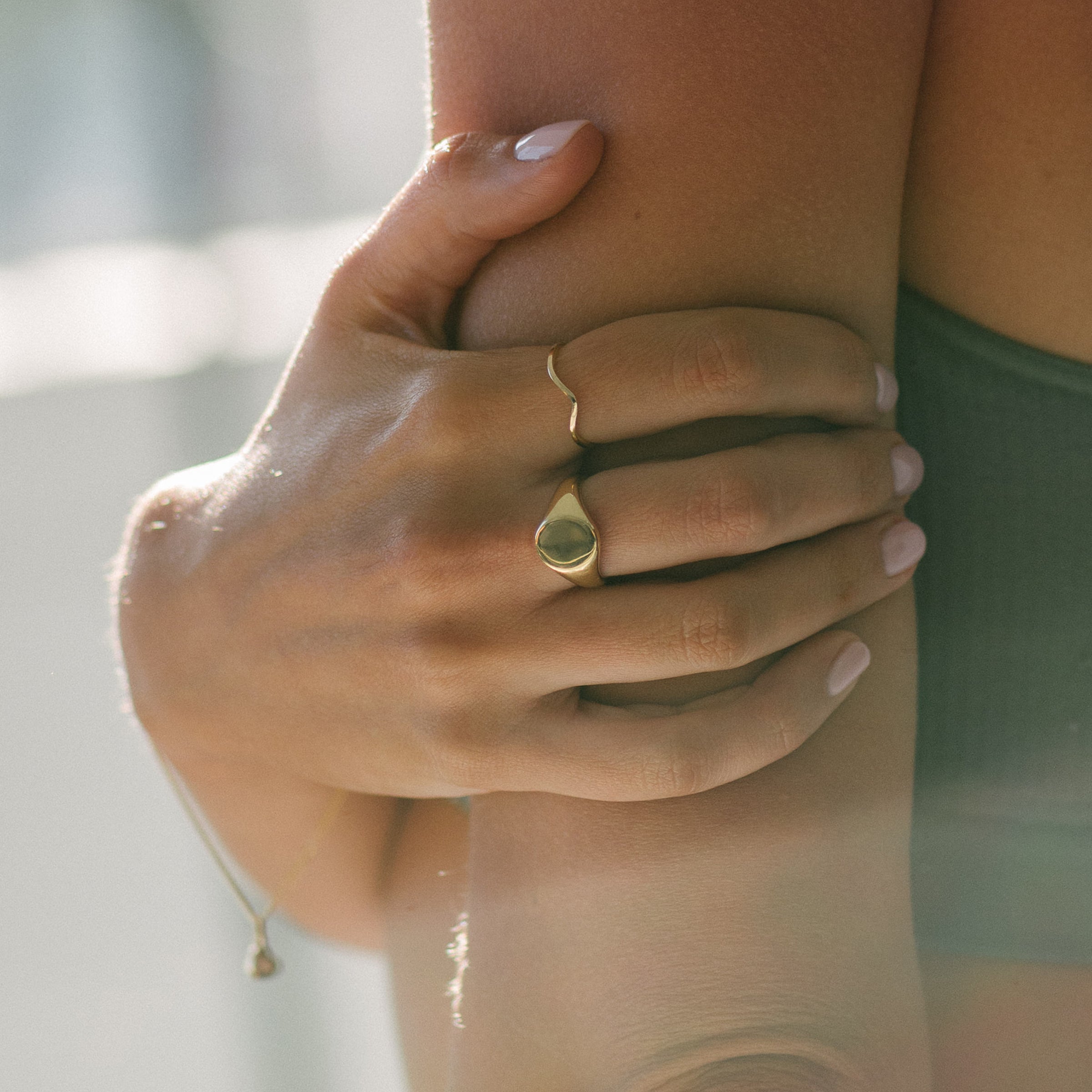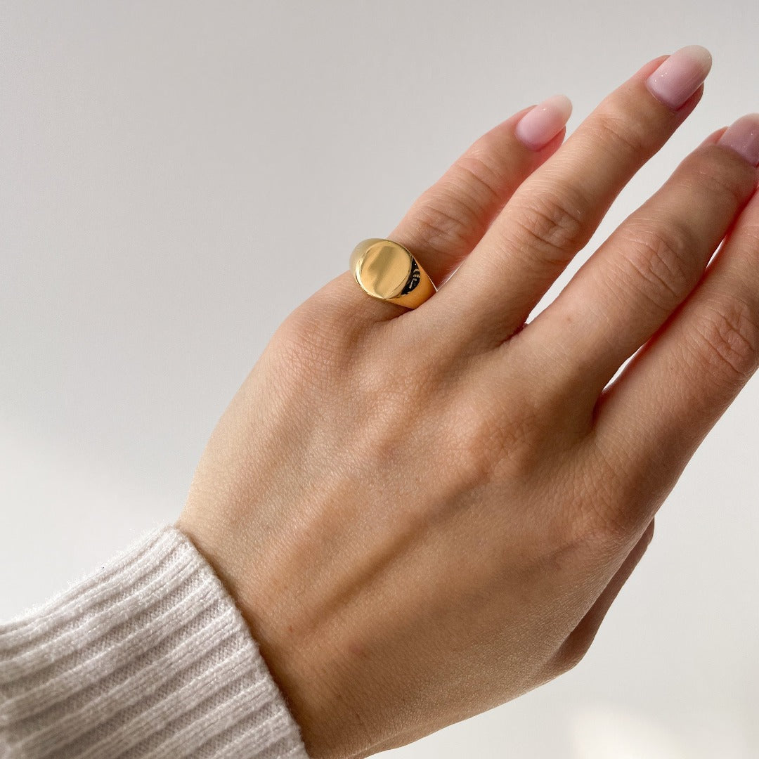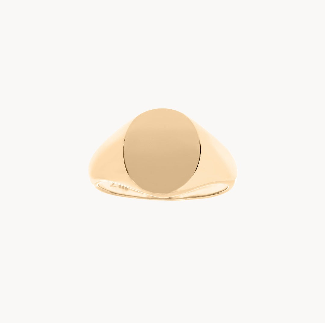 The oval gold signet ring creates a classic & regal look to any ring layering.