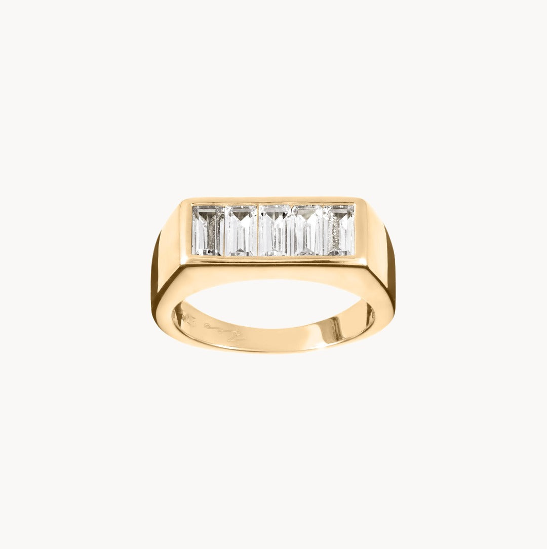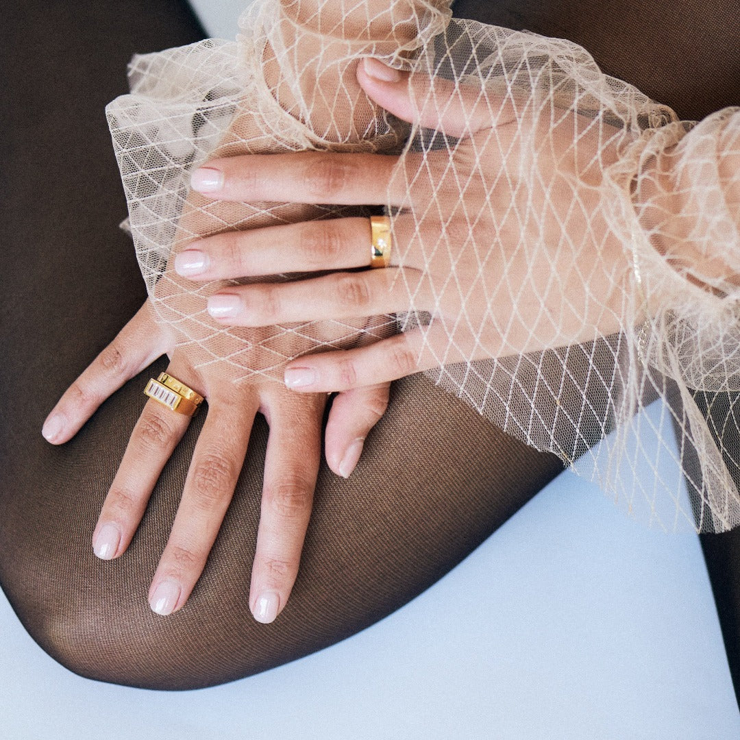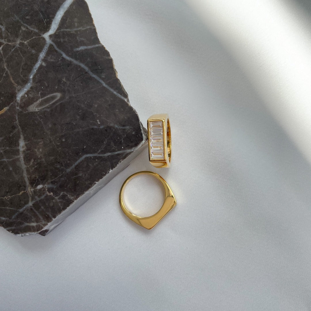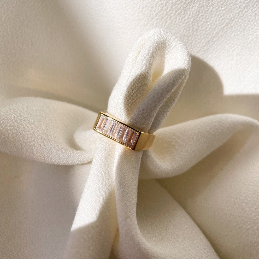 A tapered band, being 2mm x 1mm at its thinnest and 6mm x 3mm at its thickest. The stone feature on top is approximately 6mm wide x 14mm long.