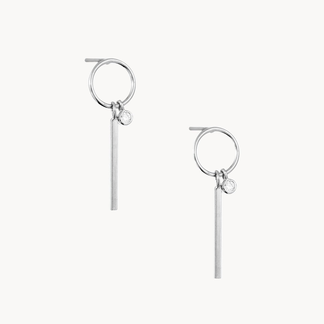 A simple yet edgy piece. The Rowe Earrings features a hollow circle with a fine bar and Cubic Zirconia hanging individually from it. The bar and stone are not soldered to the circle as they are designed to add movement to the piece.