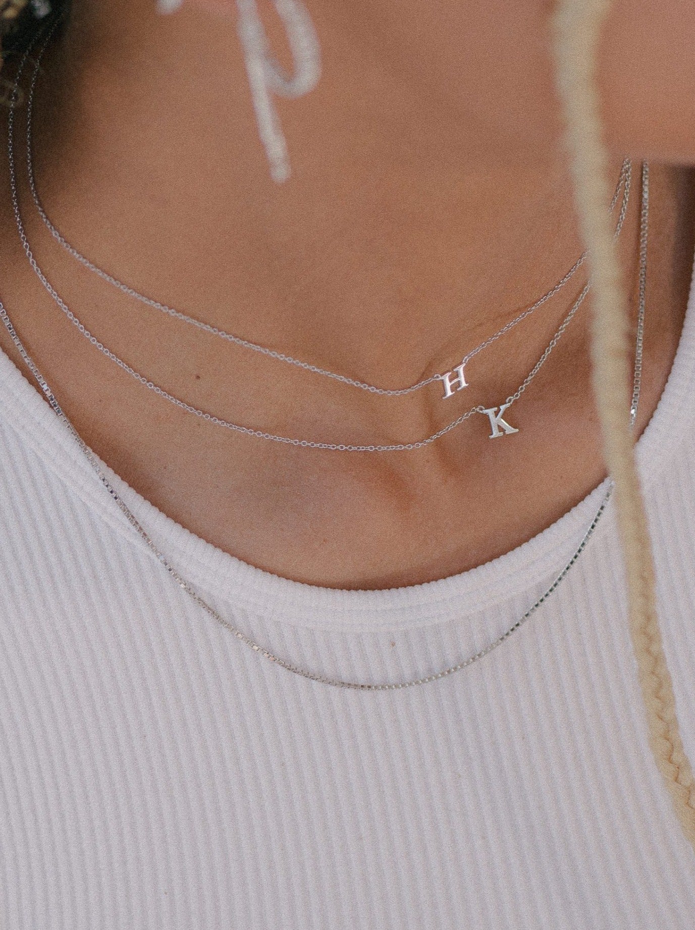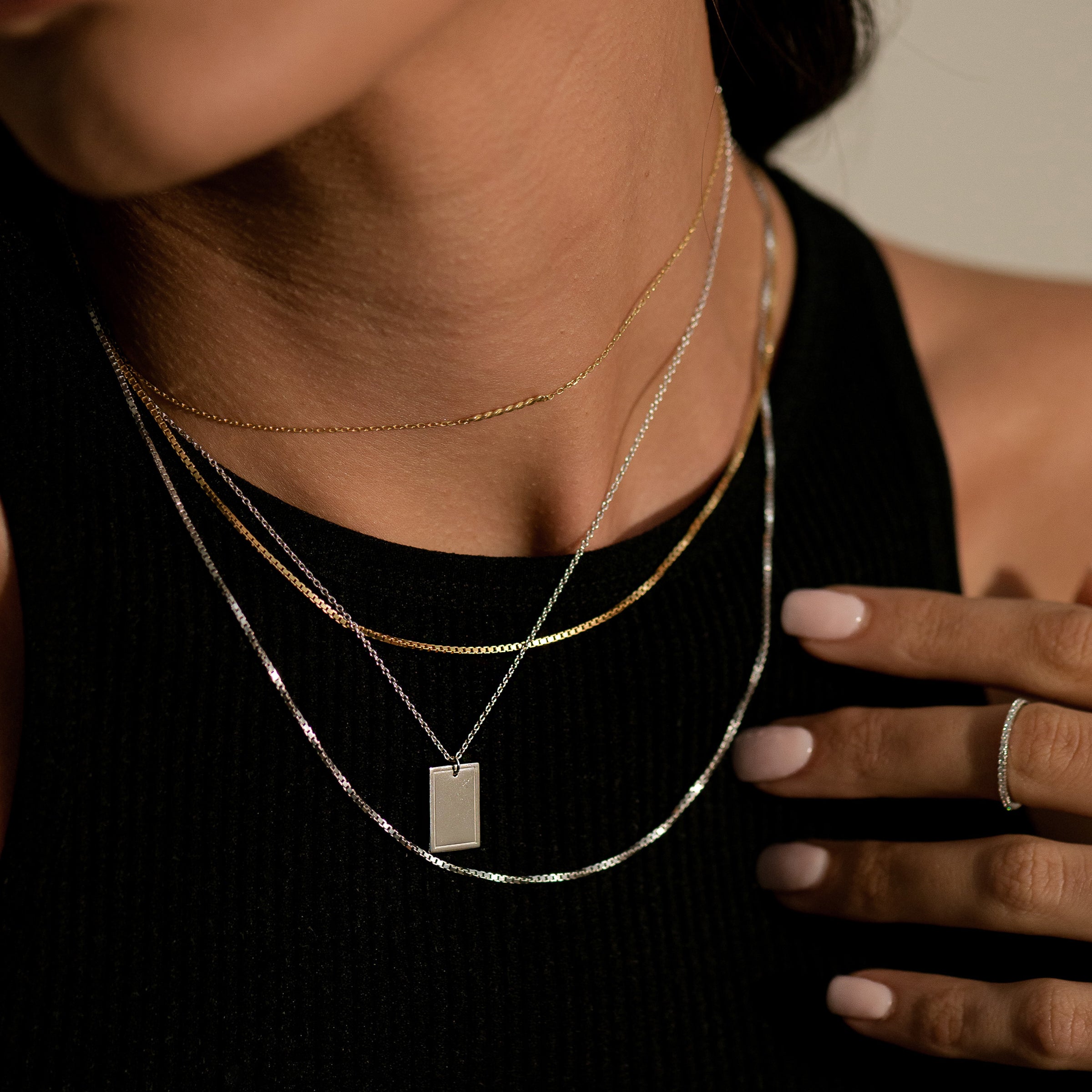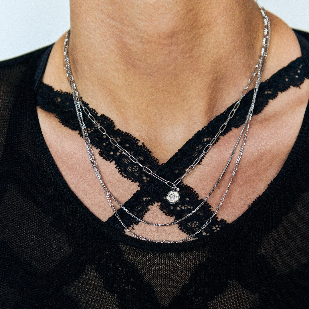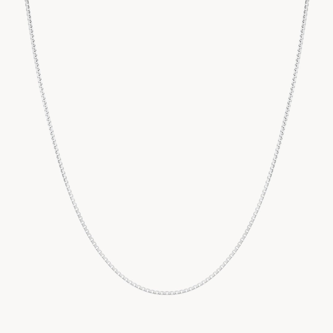 Silver box chain.