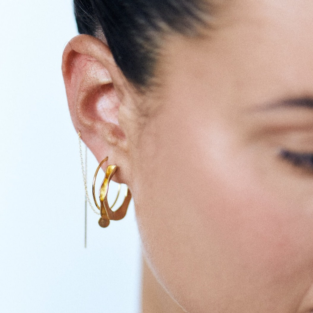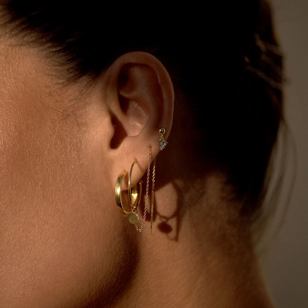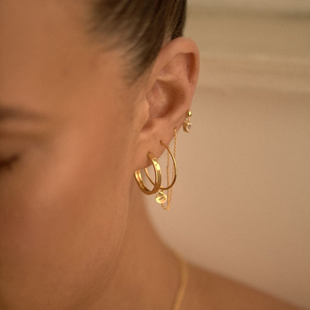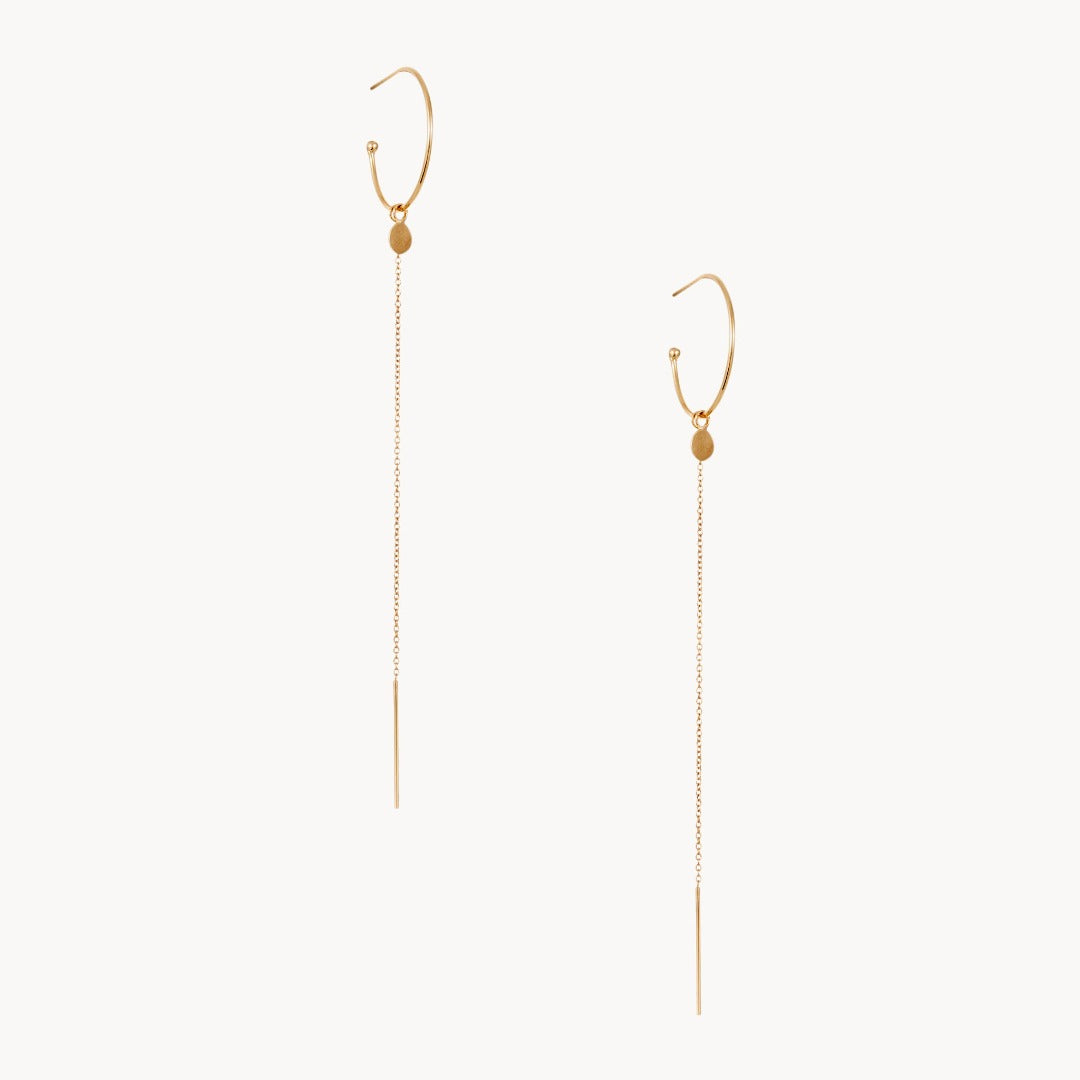 A thin hoop earring that features a fine chain that can be threaded through a second piercing. The earring also features a delicate flat disc hanging from the hoop.